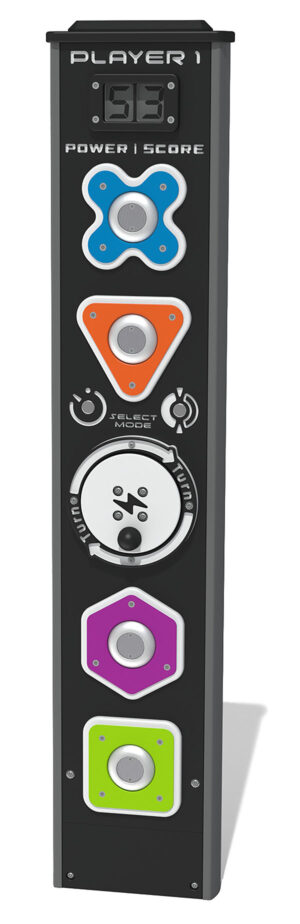 Vieno arba 2 žaidėjų reakcijos žaidimas RotoGen žmogaus maitinamas energijos skystųjų kristalų energijos matuoklis ir taškų ekranai Du 2 žaidėjų žaidimo parinktys Šviečiantys žaidimo pasirinkimo mygtukai Spalvingi LED šviečiantys žaidimo mygtukai HDPE ir aliuminio konstrukcija Paruošta montuoti su įžemintais tvirtinimo antgaliais MEDŽIAGOS Skydelis – Dviejų spalvų didelio tankio polietilenas su milteliais MESU (HDPE) Extruodam apdaila Totemas – pilnai surinktas