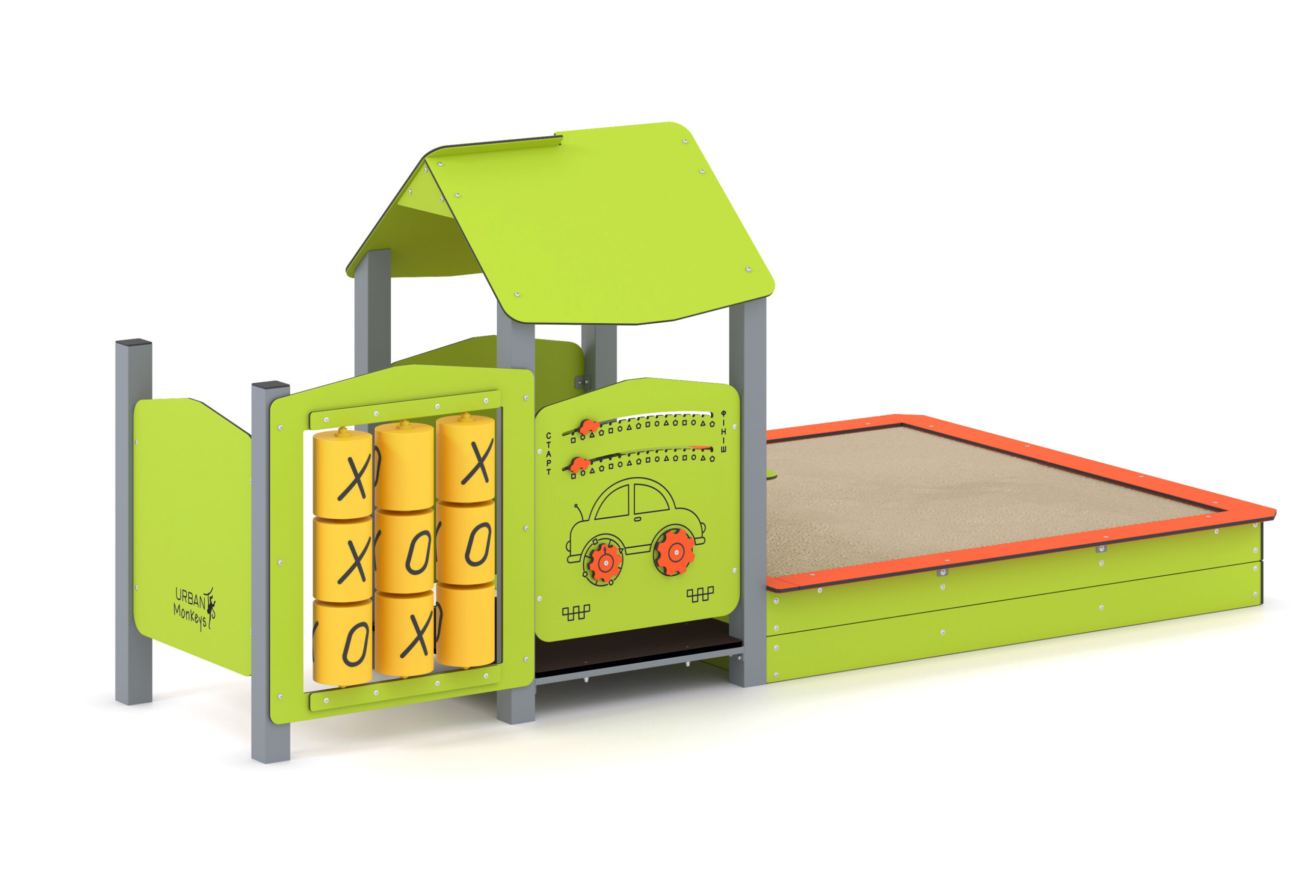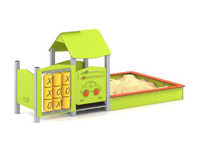 Kompleksą sudaro žaidimų plokštės, „tic-tac-toe“ modulis, stalas ir smėlio dėžė
