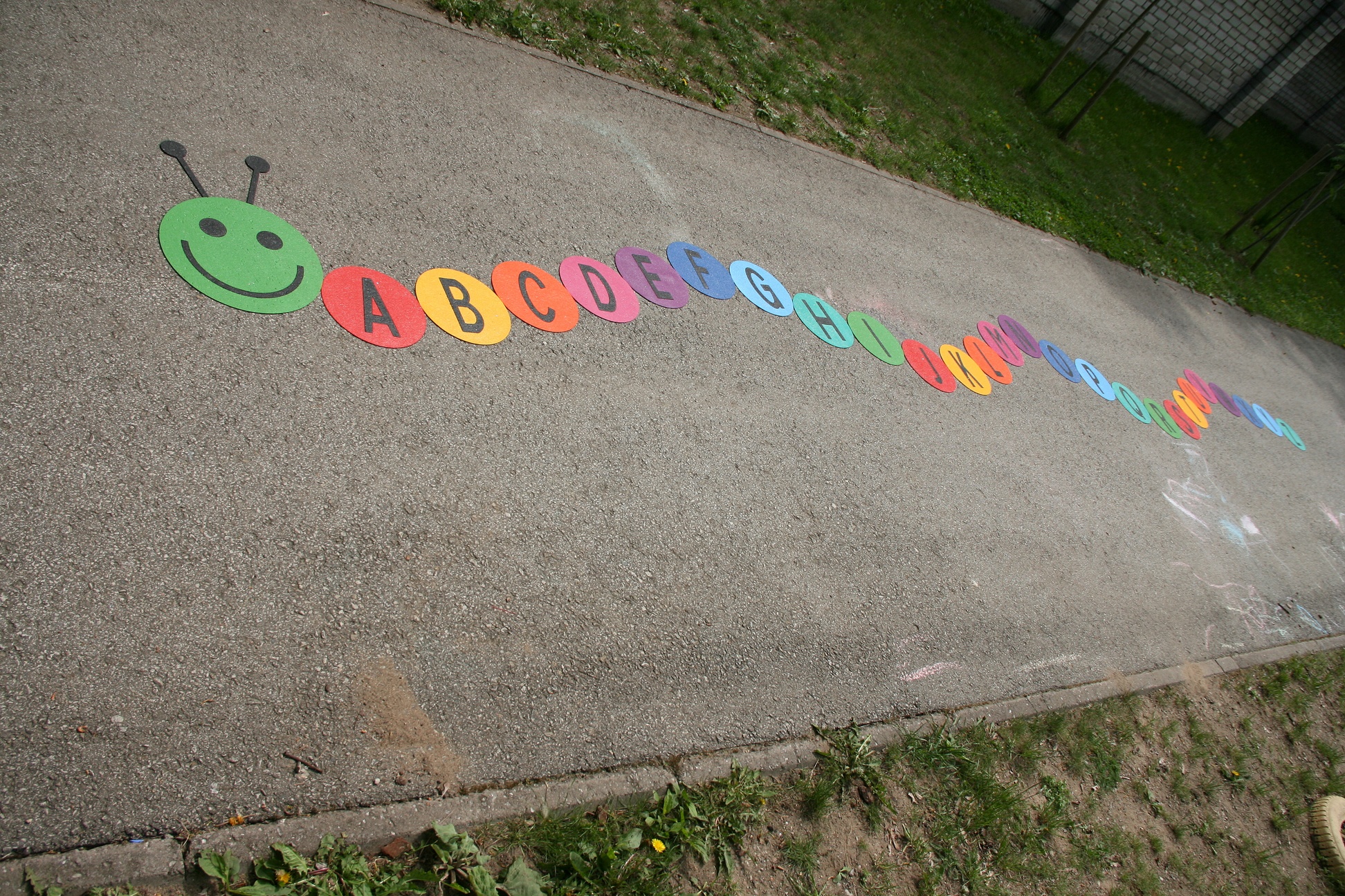 Linksmas ir spalvingas vikšras supažindina vaikus su angliška abėcėle ir kaip šokinėjant formuoti žodžius iš raidžių. Tinka mokymuisi lauke. Gaminys tinkamas montuoti ant asfalto ar akmens. Jis pritvirtinamas prie žemės kaitinant / lydant.