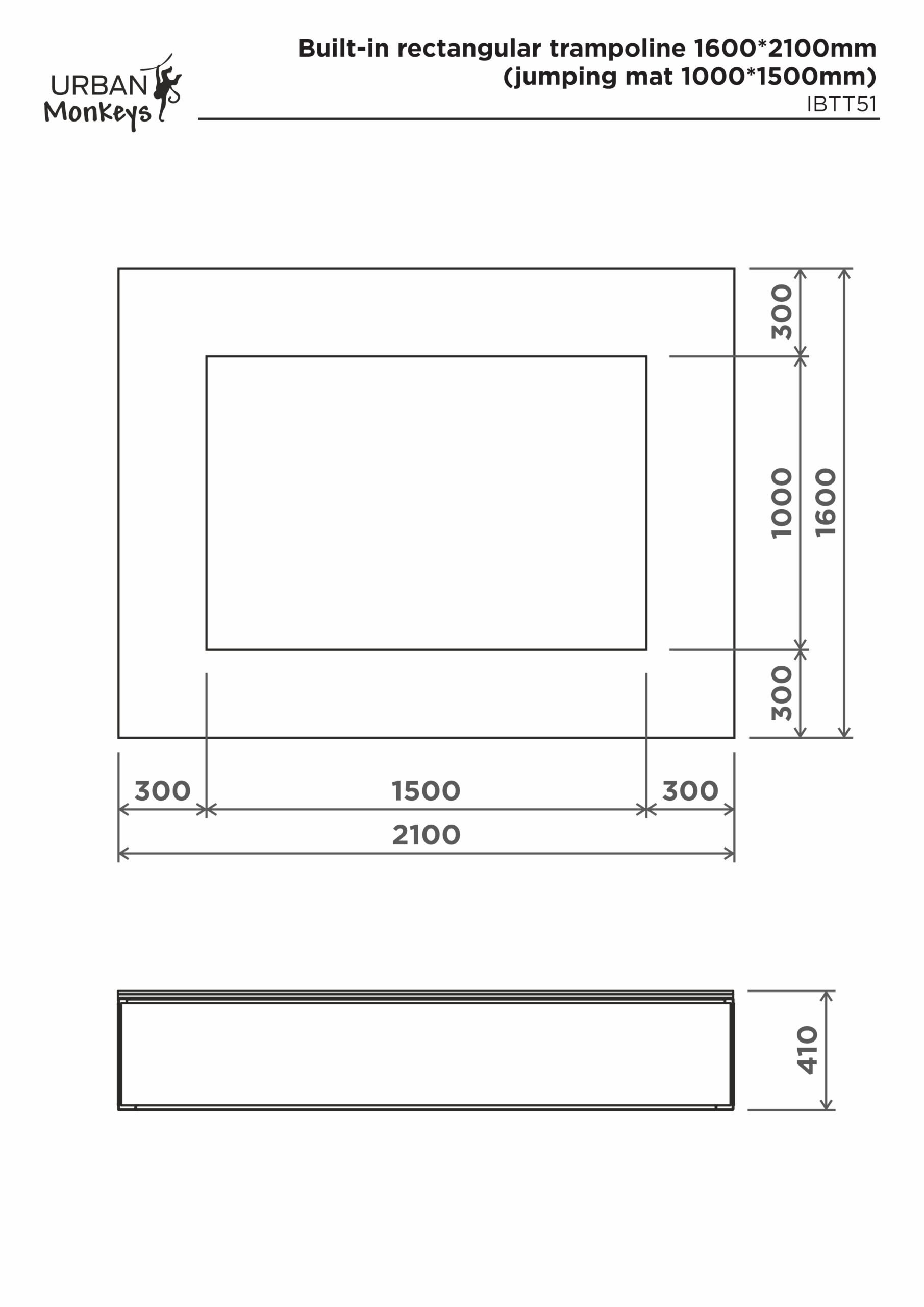Įmontuotas stačiakampis batutas 1600*2100mm (šokinėjimo kilimėlis 1000*1500mm)