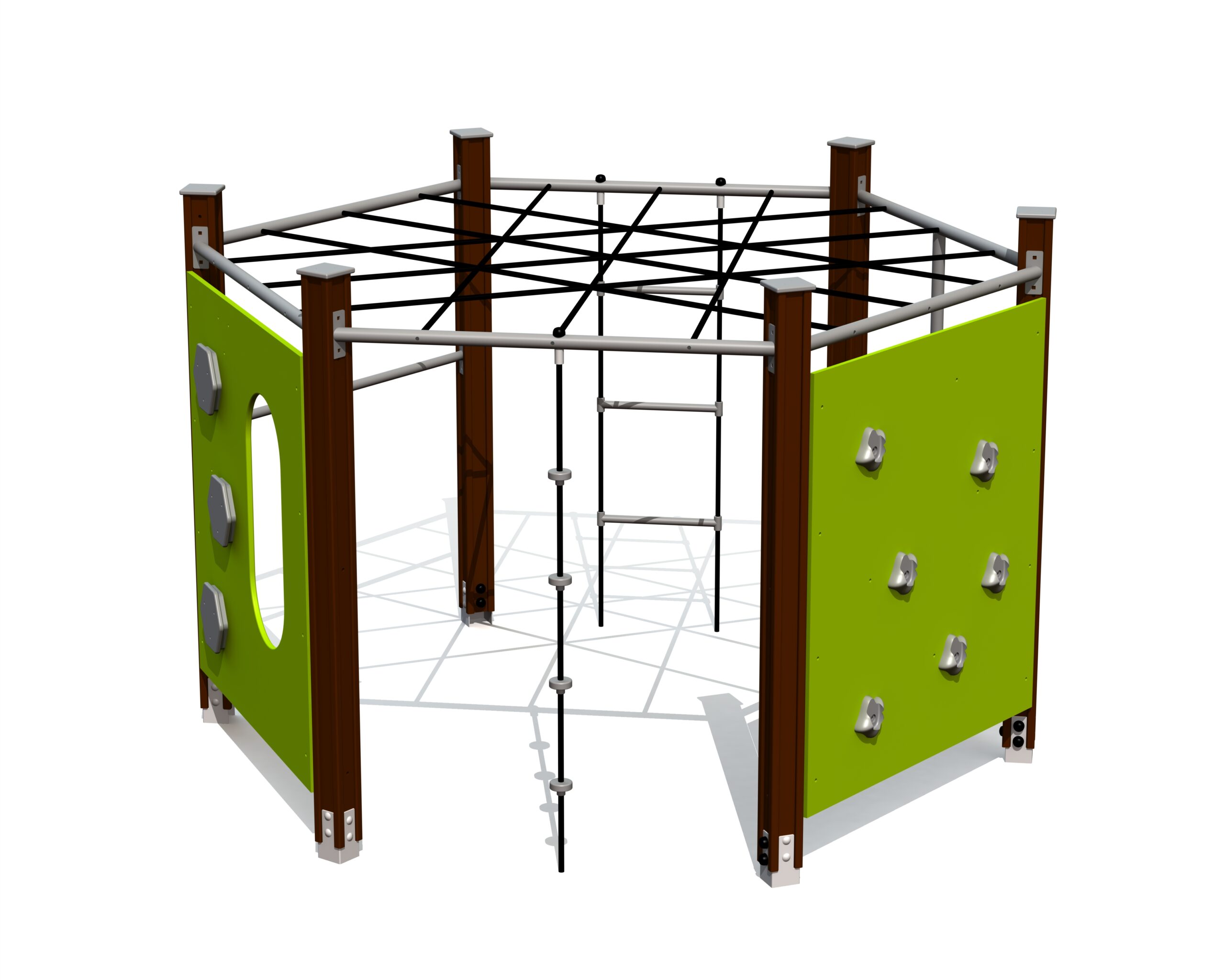 Laipiojimo įranga suteikia vaikams puikias galimybes aktyviai žaisti, gerina fizinį pasirengimą ir koordinaciją. Šis šešių pusių laipiojimo rėmas HEXAGON 2 suteikia vaikams dvi skirtingas vertikalias laipiojimo uolomis sienas, lynų kopėčias ir laipiojimo lyną su platformomis lipti aukštyn ir ugniagesio stulpą, skirtą nusileisti žemyn. Horizontalus laipiojimo tinklas dengia konstrukcijos viršų.