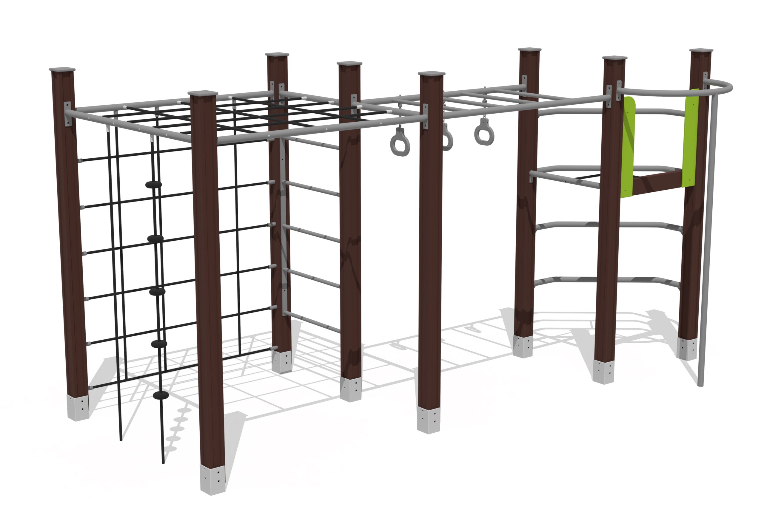 Laipiojimo rėmas MACACO siūlo įvairias laipiojimo galimybes ir sudaro kopėčias, tinklines sienas ir vamzdžius. Gimnastikos žiedai puikiai treniruoja rankų, krūtinės ir pečių raumenis.