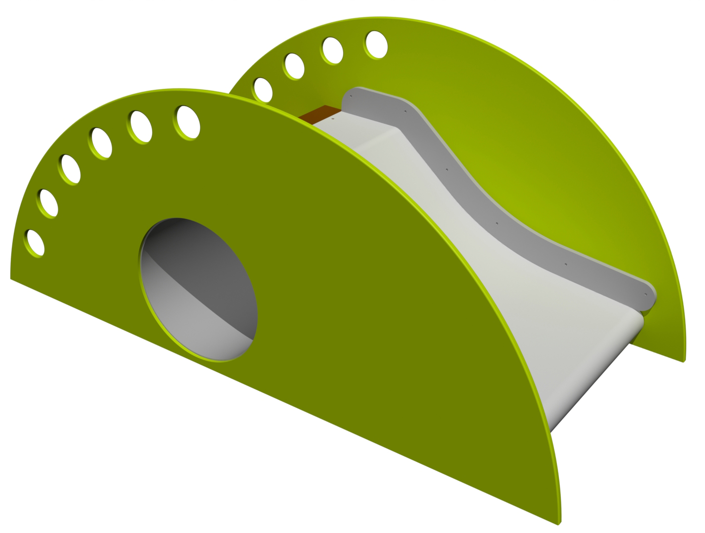 Laisvai pastatoma čiuožykla su plačiu čiuožykla. Į čiuožyklą veda nedideli laiptai, po ja yra šliaužiojamas tunelis.