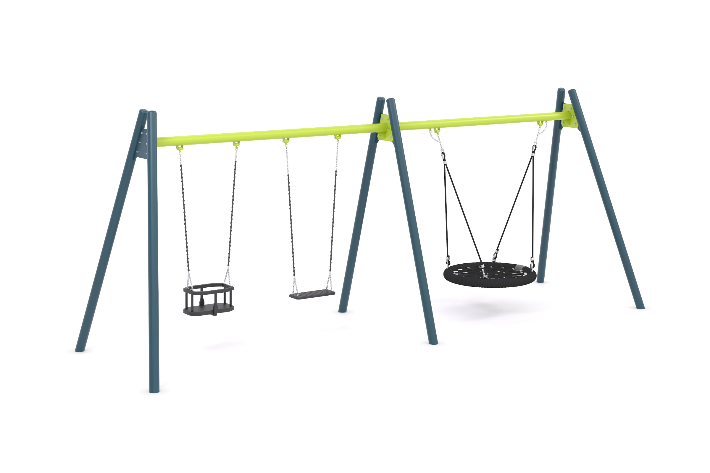Sūpynės su viena įprasta sėdyne + viena kūdikio kėdutė + viena Nest kėdutė 1000 (aukštis – 2000 mm)