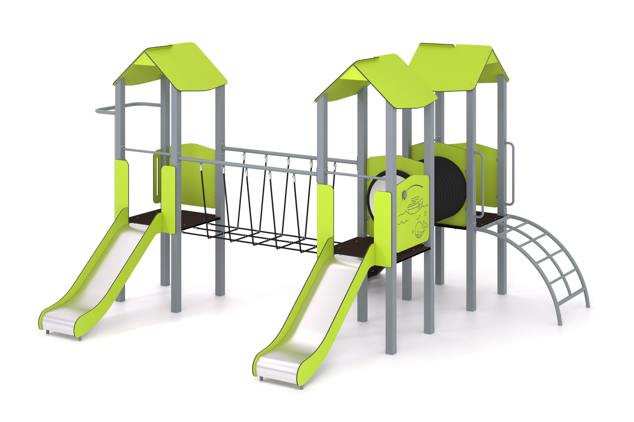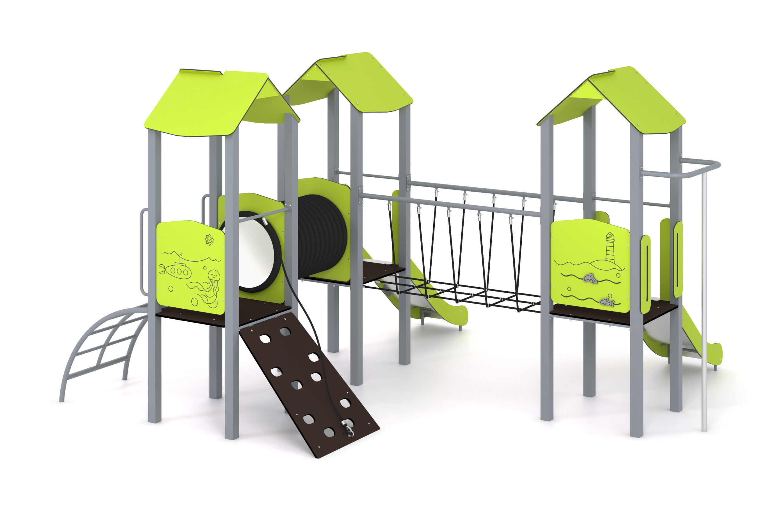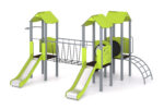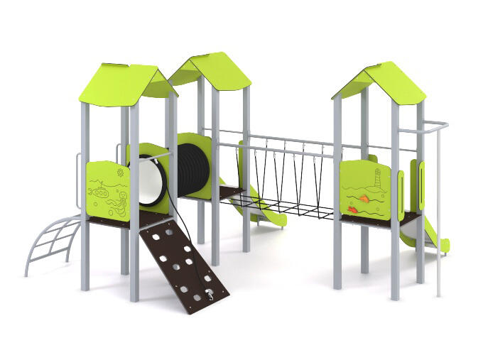 Žaidimų kompleksą sudaro čiuožyklos, ugniagesiai, kopėčios, rampa, tiltas, tunelis ir žaidimų skydai.