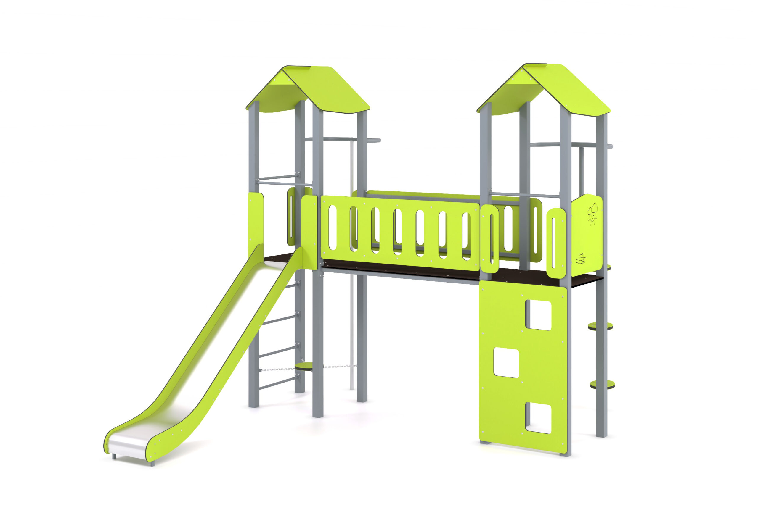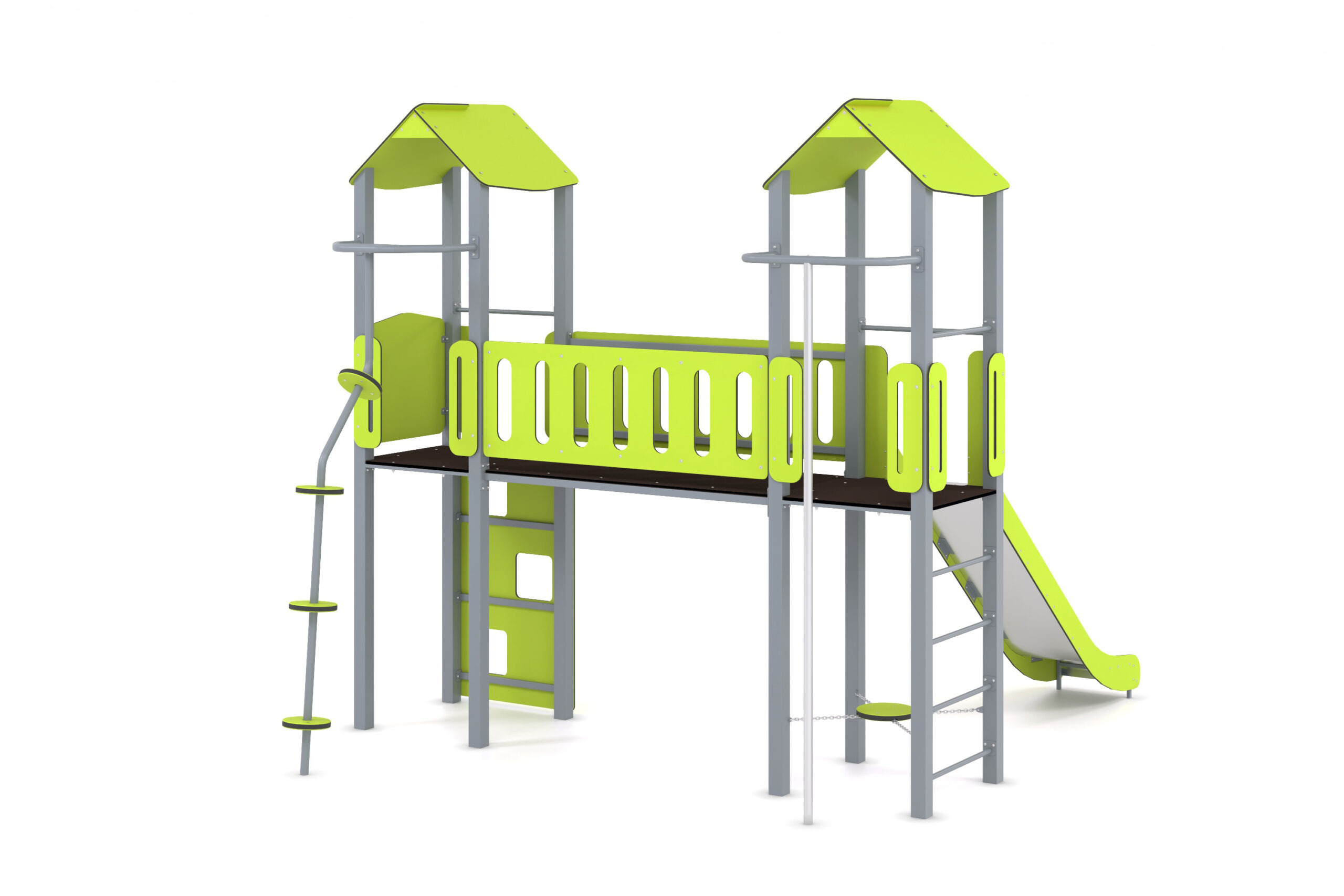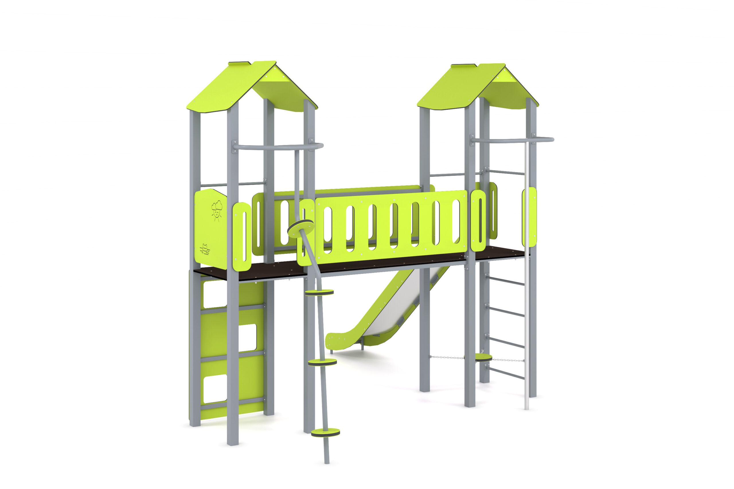 Žaidimų kompleksą sudaro čiuožykla, ugniagesiai, sėdynė ir kopėčios.