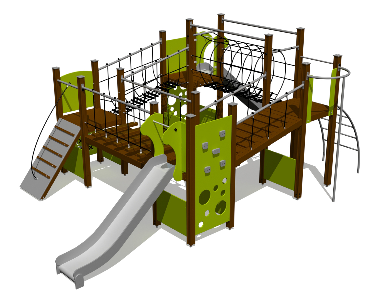 Šis žaidimų centras su keturiomis platformomis tinka lavinančiam žaidimui ir įvairioms veikloms. Į centrą galima patekti per rampą su laipteliais arba arkinėmis kopėčiomis. Dvi laipiojimo sienelės, tinklinis tunelis, pusiausvyros tiltelis su kabančiu taku, tinklinis kabantis tiltas, dvi čiuožyklos, ugniagesio stulpas ir užsiėmimų sienelė siūlo daugybę užsiėmimų ir tikra pramoga. Šoninės žaidimų centro plokštės gali būti perjungiamos įvairioms veikloms sienoms arba teminėms spausdintoms plokštėms (gyvūnams, paukščiams, žuvims, medžiams, uogoms ir kt.). Plokščių dizainas bus derinamas su klientu užsakymo metu.