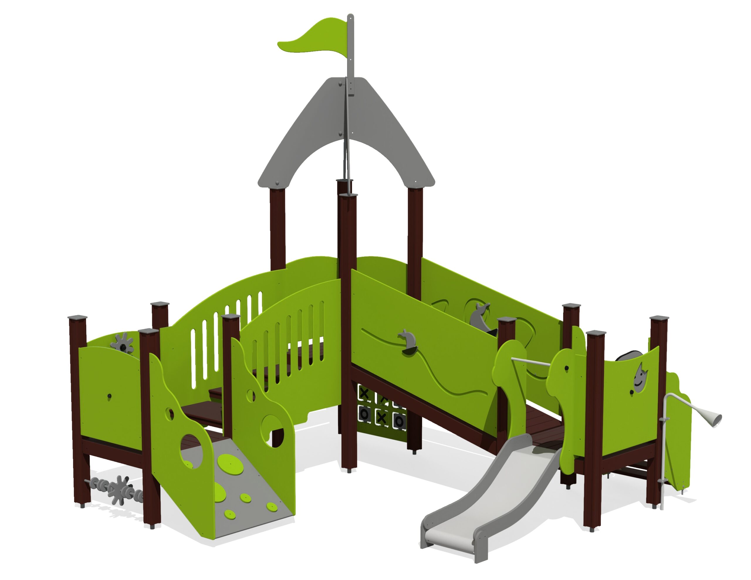 Kompaktiška vaikų žaidimų aikštelė, kurioje dera daugybė elementų, skirtų įvairiems fiziniams ir motoriniams įgūdžiams lavinti, taip pat aktyviam žaidimui. Į žaidimų aikštelę galima patekti laiptais su šoninėmis plokštėmis arba rampa su laiptelių plokštėmis. Judėjimą tarp platformų įgalina du pasvirę tilteliai, o vaikai gali čiuožti žema čiuožykla. Žaidimų aikštelėje yra keletas skirtingų žaidimų skydelių su besisukančiais diskais ir vairais, kilnojami abacus diskai, TIC-TAC-TOE žaidimas, kilnojamos burlaivių valtys, laikrodis, abėcėlės skydelis, emocijų skydelis, taip pat pokalbių vamzdžių rinkinys.