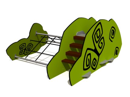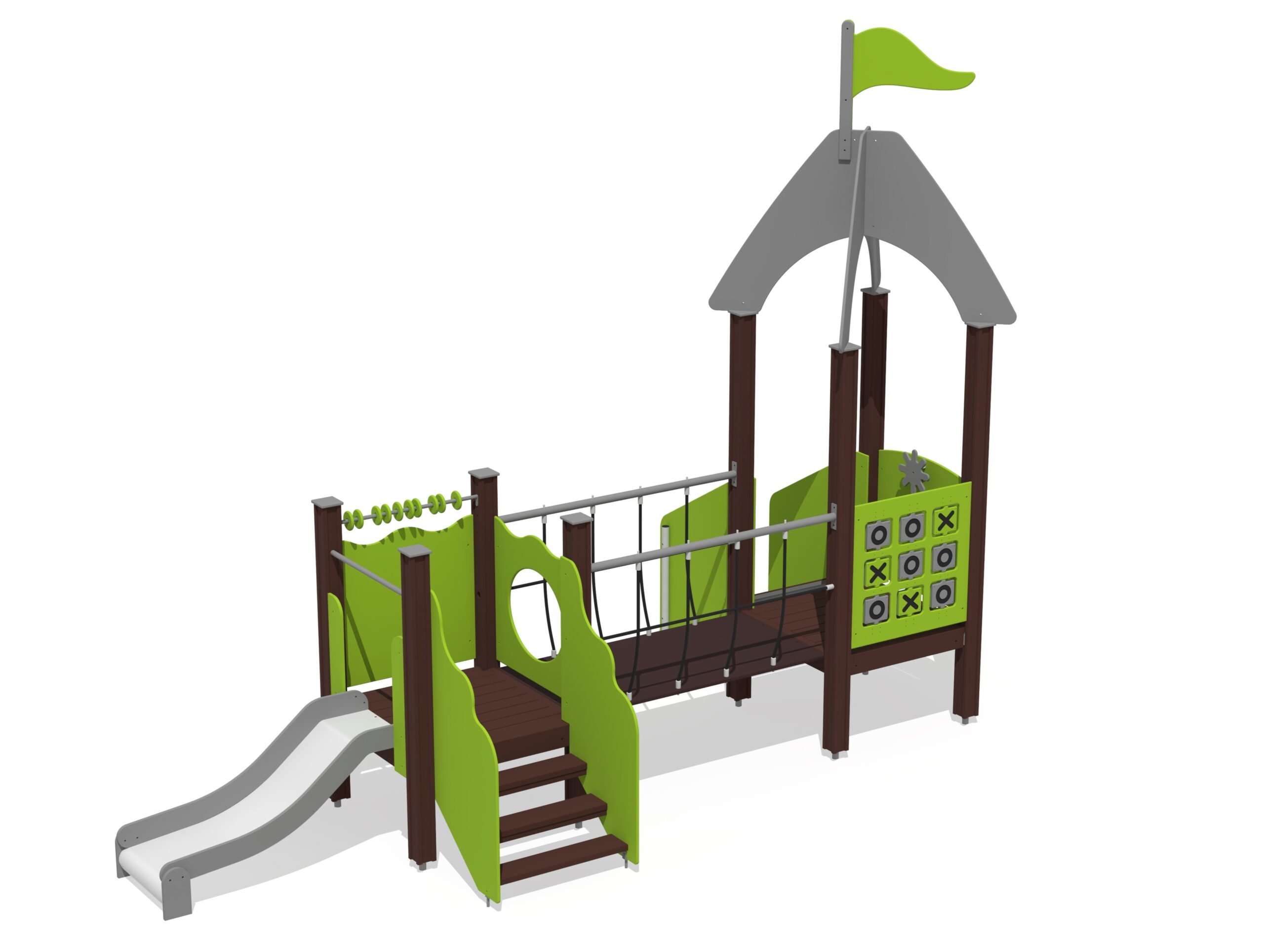 Vaikų žaidimų centras su dviem platformomis ir maža čiuožykla. Į platformas galima patekti nedideliais laiptais arba rampa su mediniais laipteliais, jos sujungtos tilteliu su turėklais. Tic-Tac-Toe žaidimas, abakas ir kapitono vairas suteikia dar daugiau pramogų. Šoninės žaidimų centro plokštės gali būti perjungiamos įvairioms veikloms sienoms arba teminėms spausdintoms plokštėms (gyvūnams, paukščiams, žuvims, medžiams, uogoms ir kt.). Plokščių dizainas bus derinamas su klientu užsakymo metu.