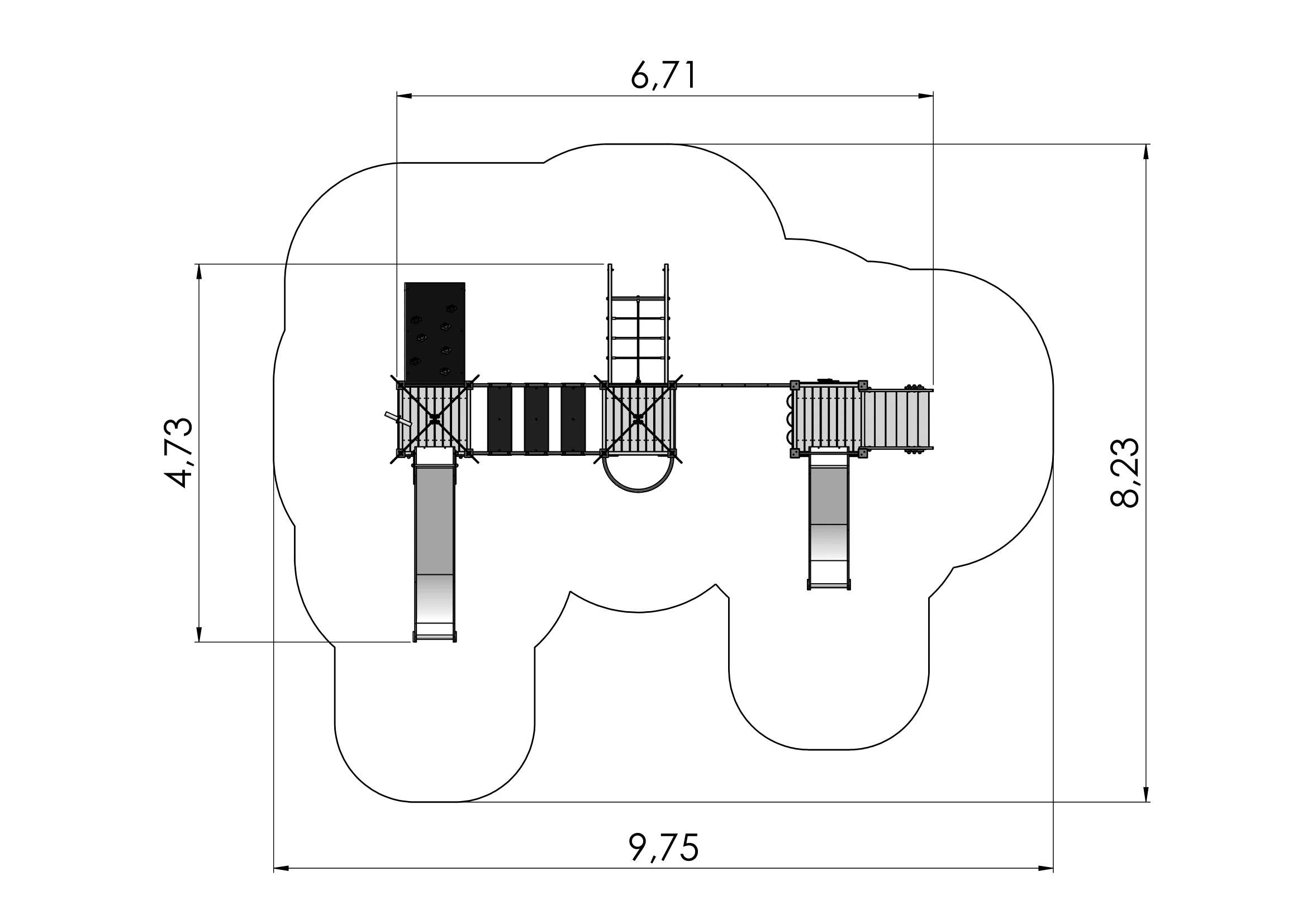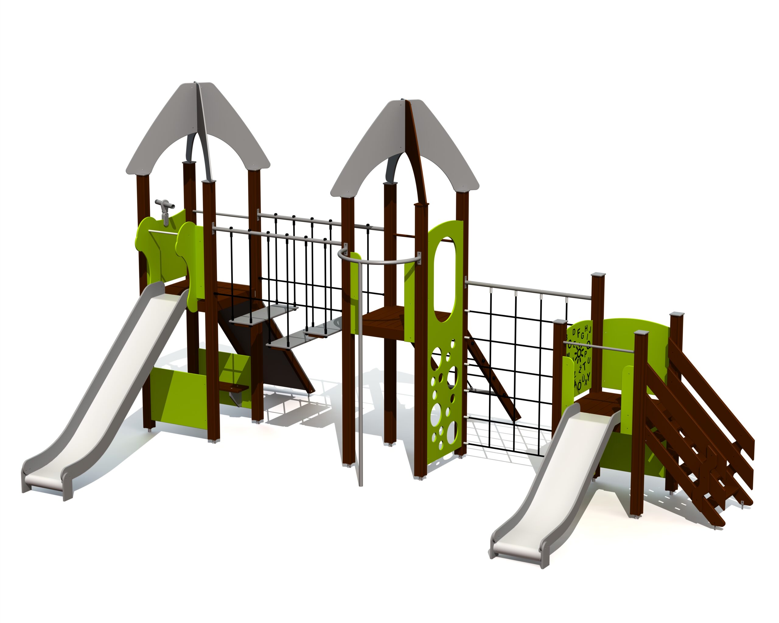 Šis žaidimų centras su trimis platformomis, dviem čiuožyklomis ir keliais laipiojimo elementais tinka kūrybiškam žaidimui ir tyrinėjimams. Laiptai su turėklais veda į apatinę platformą, kurioje yra Tic-Tac-Toe žaidimas, laikrodžio skydelis ir čiuožykla. Į aukštesnes platformas veda laipiojimo uolomis siena arba tinklinė nuožulni siena. Aukščiausias platformas jungia pusiausvyros tiltelis su turėklais ir judančiais laipteliais. Nuo aukštesnių platformų čiuožykla ir ugniagesio stulpas leidžia pasiekti žemę. Dvi skirtingos laipiojimo sienos suteikia galimybę išbandyti savo jėgą. Linksmas žaidimų kampelis su suoliuku gali būti komplektuojamas su virtuvės arba automobilio prietaisų skydelio elementais. Šoninės žaidimų centro plokštės gali būti perjungiamos įvairioms veikloms sienoms arba teminėms spausdintoms plokštėms.