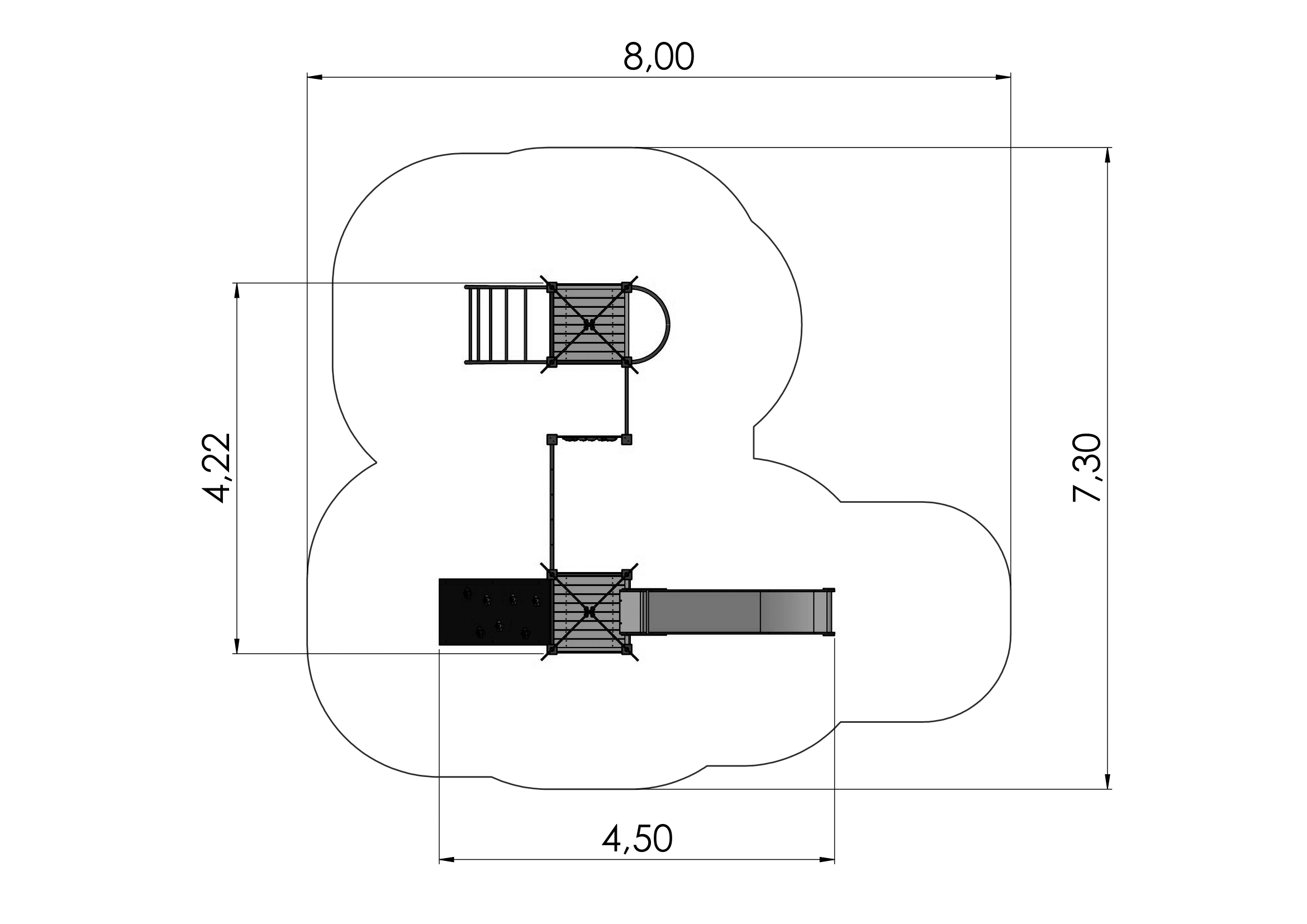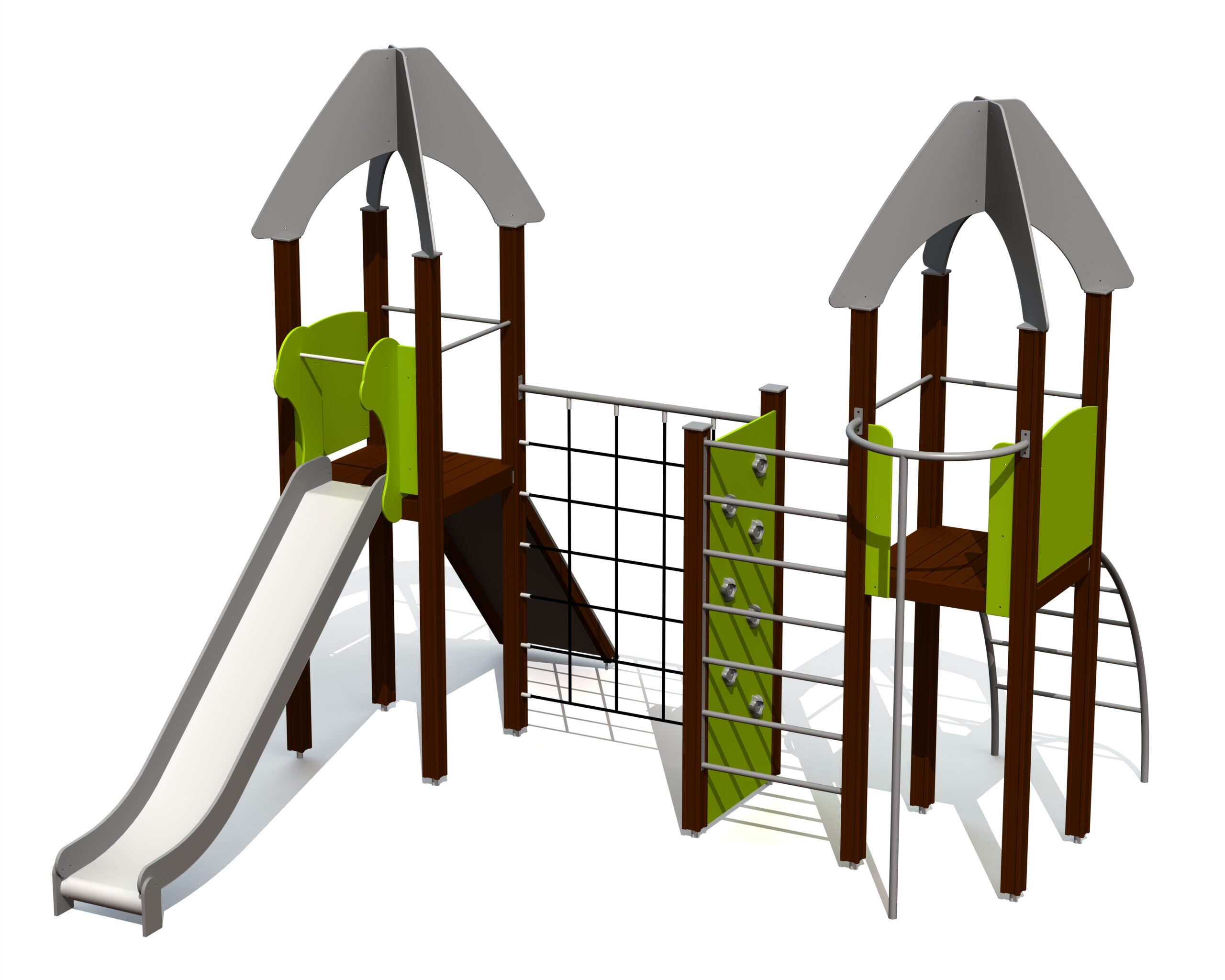 Žaidimų centras su dviem platformomis, sujungtomis tinkline laipiojimo sienele, vertikaliomis kopėčiomis ir laipiojimo uolomis sienele. Į platformas galima patekti laipiojimo uolomis šlaitu arba arkinėmis kopėčiomis. Čiuožykla ir ugniagesio stulpas suteikia galimybę nusileisti iš centro. Šoninės žaidimų centro plokštės gali būti perjungiamos įvairioms veikloms sienoms arba teminėms spausdintoms plokštėms (gyvūnams, paukščiams, žuvims, medžiams, uogoms ir kt.). Plokščių dizainas bus derinamas su klientu užsakymo metu.