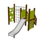 Vaikų žaidimų centras su laiptais su turėklais, laipiojimo sienele, laipiojimo tinkleliu ir smagiu „Tic-Tac-Toe“ žaidimu. Šoninės žaidimų centro plokštės gali būti perjungiamos įvairioms veikloms sienoms arba teminėms spausdintoms plokštėms (gyvūnams, paukščiams, žuvims, medžiams, uogoms ir kt.). Plokščių dizainas bus derinamas su klientu užsakymo metu.