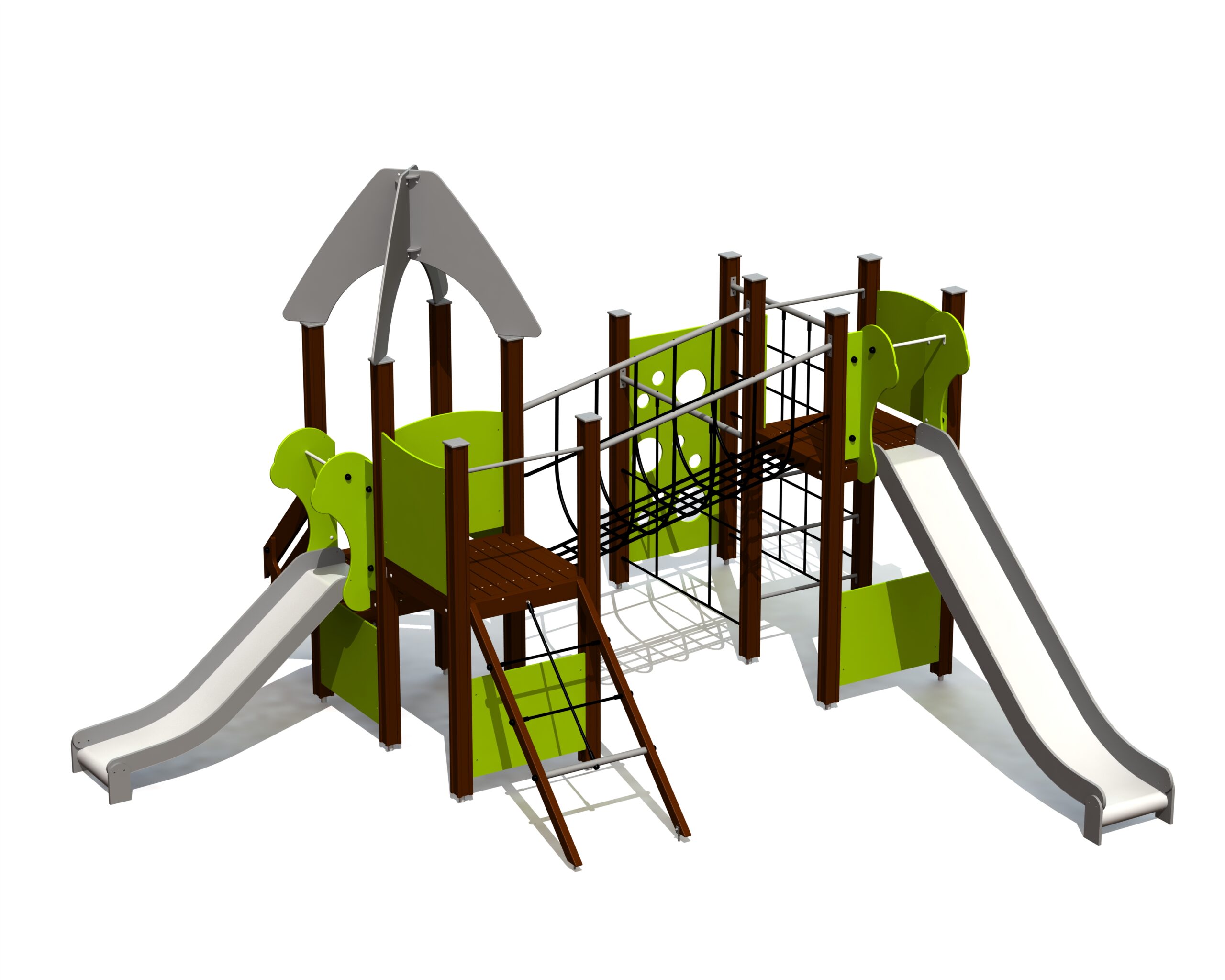 Žaidimų centras su trimis skirtingo aukščio platformomis, dviem čiuožyklomis ir laipiojimo sienelėmis. Į centrą veda laiptai su turėklais ir laipiojimo tinklo šlaitu. Tinklinis tiltelis su turėklais veda į aukščiausią platformą. Dvi tinklinės sienos, kopėčios ir laipiojimo sienelė su skylutėmis suteikia galimybę lavinti vikrumą ir laipiojimo įgūdžius. Two slides provide a way down. Šoninės žaidimų centro plokštės gali būti perjungiamos įvairioms veikloms sienoms arba teminėms spausdintoms plokštėms (gyvūnams, paukščiams, žuvims, medžiams, uogoms ir kt.). Plokščių dizainas bus derinamas su klientu užsakymo metu.