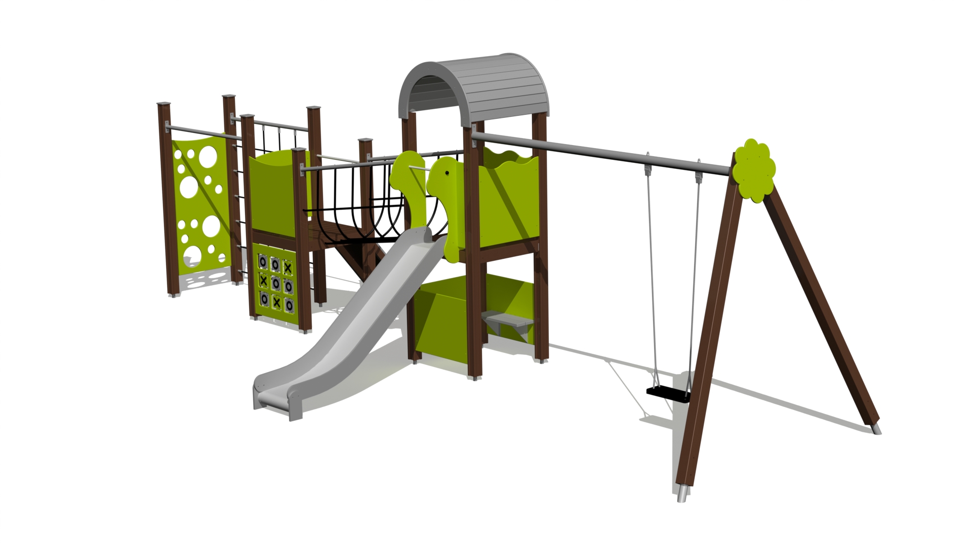 Šis universalus žaidimų centras su dviem platformomis, tinkliniu tilteliu, laipiojimo sienele, aktyviu skydeliu ir sūpynėmis yra geriausias pasirinkimas aktyviam žaidimui. Į žaidimų centrą galima patekti per laipiojimo uolomis šlaitą. Po aukštesne platforma paslėptas žaidimų kampelis su suoliuku, kuriame gali būti sumontuoti virtuvės ar automobilio prietaisų skydelio elementai. Prie žaidimų centro pritvirtinta tvirta metalinė sija, kurioje telpa aliuminiu sustiprinta guminė sūpynių sėdynė (sūpynių komplektas KRK2 įeina į šios prekės kainą). Šoninės žaidimų centro plokštės gali būti perjungiamos įvairioms veikloms sienoms arba teminėms spausdintoms plokštėms (gyvūnams, paukščiams, žuvims, medžiams, uogoms ir kt.). Plokščių dizainas bus derinamas su klientu užsakymo metu.