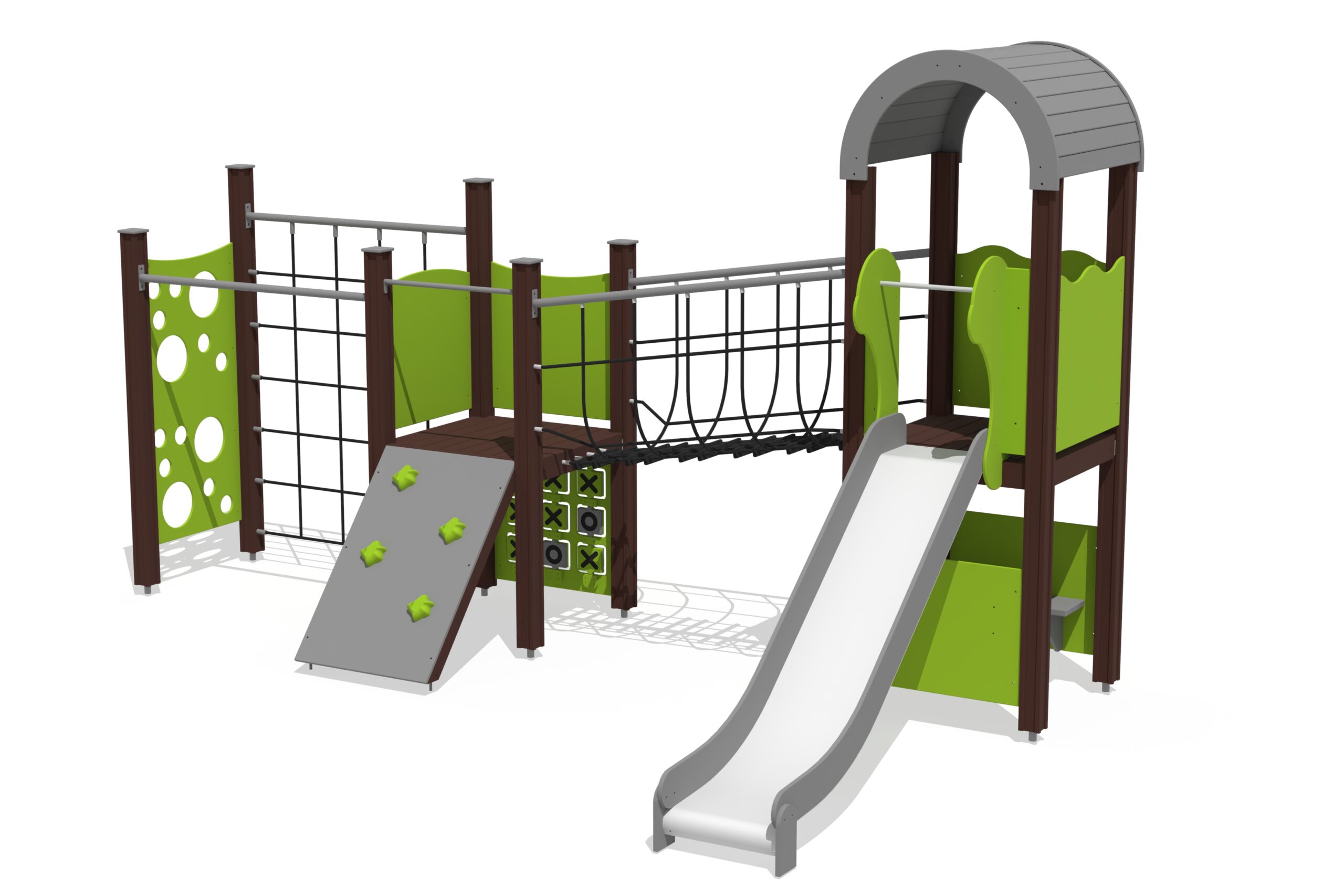 Šis žaidimų centras su dviem platformomis, tinkliniu tilteliu, laipiojimo sienele ir žaidimo elementais tinka įvairioms lavinančioms veikloms. Į centrą galima patekti per laipiojimo uolomis šlaitą, dvi platformas jungia tinklinis tiltas su turėklais. Centre yra Tic-Tac-Toe žaidimas, o po stogu dengta platforma yra paslėptas linksmas žaidimų kampelis su suoliuku, prie kurio gali būti pritvirtinti virtuvės arba automobilio prietaisų skydelio elementai. Šoninės žaidimų centro plokštės gali būti perjungiamos įvairioms veikloms sienoms arba teminėms spausdintoms plokštėms (gyvūnams, paukščiams, žuvims, medžiams, uogoms ir kt.). Plokščių dizainas bus derinamas su klientu užsakymo metu.