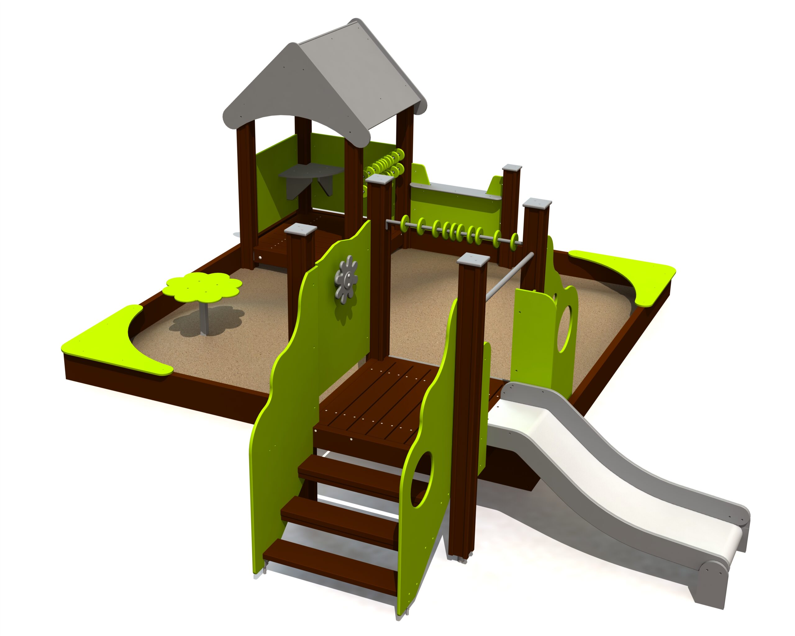 Mažylių žaidimų centras su žaidimų nameliu ir smėlio dėže, kuriame viename komplekse sujungiamos kelios vaikų mėgstamos veiklos. Jo laiptai su šoninėmis plokštėmis veda į veiklos skydais išklotą platformą, kurioje įrengta čiuožykla. Smėlio dėžėje yra nedidelis žaidimų stalas, o jo kampuose yra papildomos platformos įvairiems smėlio kūriniams. Žaidimų namas su stogu suteikia pavėsį ir yra tinkamas vaidmenims. Centre įrengtos kelios judančios žaidimų sienos ir kapitono vairas, padedantis lavinti smulkiąją motoriką.