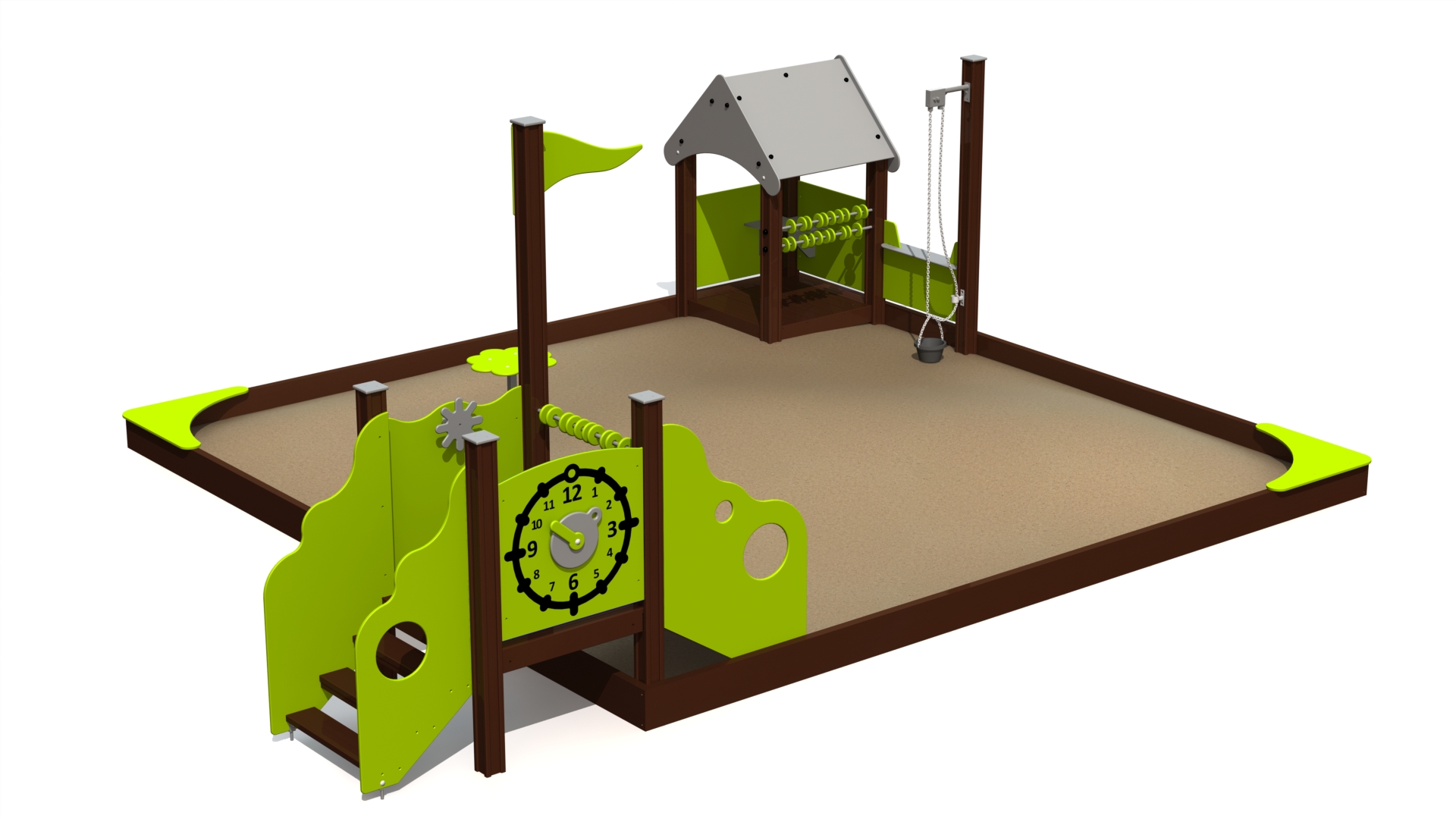 Vaikų žaidimų miestelis su žaidimų nameliu, laipiojimo platforma ir smėlio dėže sujungia keletą mėgstamų užsiėmimų į vieną vientisą rinkinį. Mieste yra šoniniai laiptai, vedantys į platformą, ir rampa, kuri nusileidžia į smėlio dėžę. Platformoje yra veiklos žaidimų, įskaitant laikrodį, vairą ir abakusą. Smėlio dėžėje yra mažas žaidimų stalas ir kampinės plokštės, skirtos smėlio pyragams gaminti. Stogu dengtame žaidimų namelyje galima žaisti vaidmenų žaidimus su prekystaliu, abaku, smėlio kibiru. Žaidimų namelis taip pat suteikia pavėsį nuo saulės.
