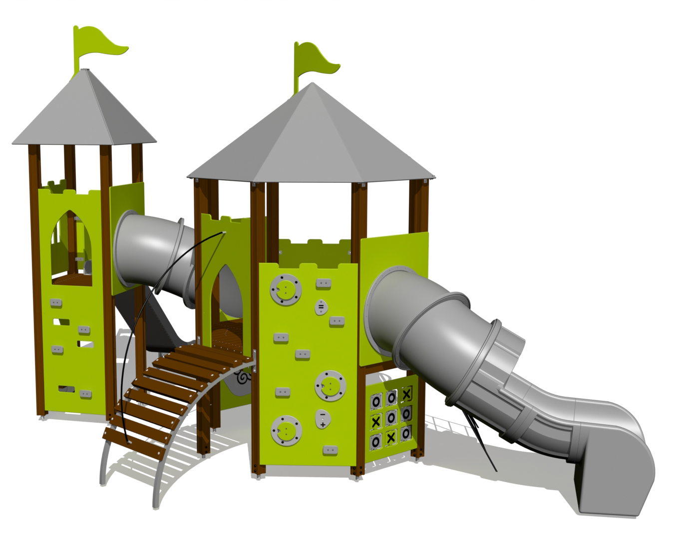 Šis į pilį panašus žaidimų centras su dideliu aštuonkampiu bokštu su stogu skatina vaizduotę ir aktyvų žaidimą. Į didelę platformą veda arkinės kopėčios, aukščiau – šliaužimo tunelis, o čiuožykla, tunelinė čiuožykla ir ugniagesio stulpas leidžia vėl lėkti žemyn. Laipiojimo uolomis sienelės ir laipiojimo sienelės su skylutėmis, kurios puošia bokšto ir bokštelio šonus, taip pat nuožulni tinklinė siena, vedanti į aukštesnį bokštą, suteikia galimybę išmokti laipiojimo, pusiausvyros ir vikrumo įgūdžių. Kelios veiklos skydeliai ir žaidimas „Tic-Tac-Toe“, taip pat žaidimų kampelis su suoliuku, prie kurio galima pritvirtinti virtuvės arba automobilio prietaisų skydelio elementus, patenkins visus vaidmenų žaidimo poreikius. Šoninės žaidimų centro plokštės gali būti perjungiamos įvairioms veikloms sienoms arba teminėms spausdintoms plokštėms (gyvūnams, paukščiams, žuvims, medžiams, uogoms ir kt.). Plokščių dizainas bus derinamas su klientu užsakymo metu.