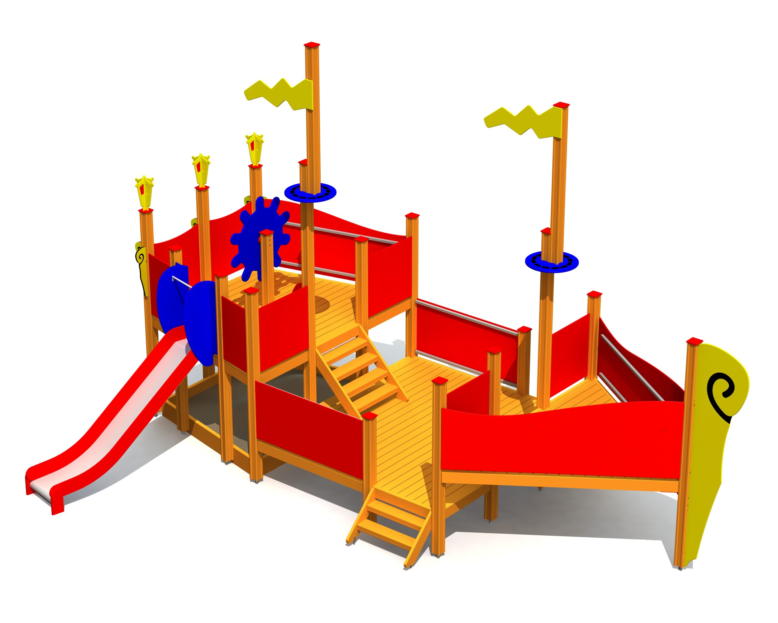 Šis puikus medinis burlaivis GUSTAV VASA tinka mažiems vaikams. Laivas turi tris platformas, kurių aukštis 0,45 m, 0,9 m ir 1,2 m. Laiptais galite pasiekti įvairias platformas. Aukščiausioje platformoje yra kapitono vairas ir čiuožykla; po platforma yra smėlio dėžė. Už papildomą mokestį standartines gaminio plokštes galima pakeisti aktyvumo skydeliais.